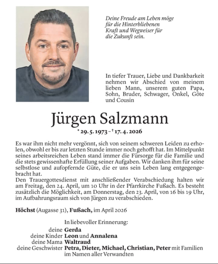 Hoechst/Fußach: Am 17.04. ist Jürgen Salzmann verstorben. Unsere Anteilnahme gilt allen Angehörigen und Freunden.